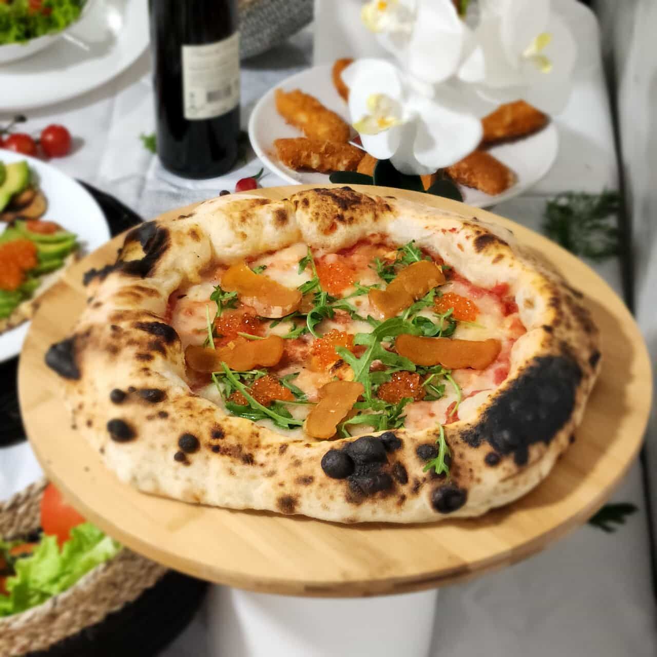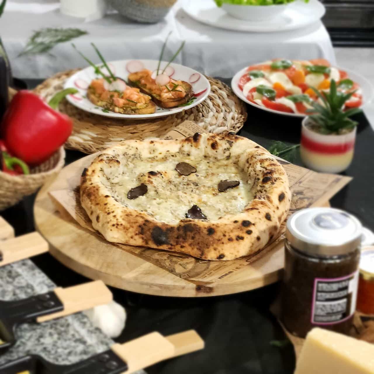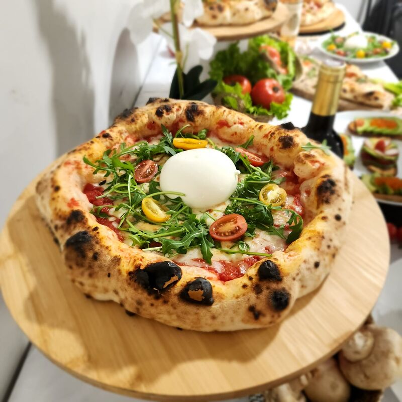 La prestation à domicile comprend de nombreuses pizzas à partager et vous réserve une gamme luxe en option (truffe, boutargue, burrata..)..